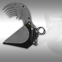 La largeur d'ouverture des pelles est d'environ 90 cm. Le design en forme de faucille de la pince supérieure empêche l'empâtement du matériau. En enlevant les deux poches latérales, vous pouvez utiliser cette benne pour transporter et ramasser des billes ou d'autres matériaux plus longs.